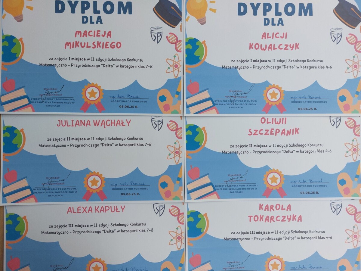 W tym roku szkolnym wystartowała II edycja Szkolnego Konkursu Matematyczno - Przyrodniczego "Delta". Konkurs był realizowany w dwóch poziomach; klasy 4-6 i 7-8. W pierwszym etapie zostały wyłonione po dwie osoby z każdej klasy. Ich zadaniem było zmierzyć się z 10 zadaniami z przedmiotów matematyczno - przyrodniczych. W klasie 8c była dogrywka. Do finału przeszło 13 osób z klas 4-6 i 12 osób z klas 7-8. W tym etapie uczniowie rozwiązywali 15 zadań wśród nich były i otwarte i zamknięte. Laureatami zostali: