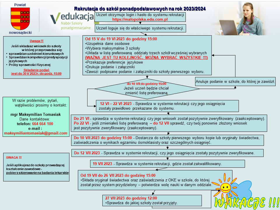 Terminy przeprowadzania postępowania rekrutacyjnego i postępowania uzupełniającego, a także terminy składania dokumentów do klas I publicznych szkół ponadpodstawowych, tj.: liceum ogólnokształcącego, technikum, branżowej szkoły I stopnia i klasy wstępnej, o której mowa w art. 25 ust. 3 ustawy - Prawo oświatowe na terenie województwa małopolskiego na rok szkolny 2023/2024.
